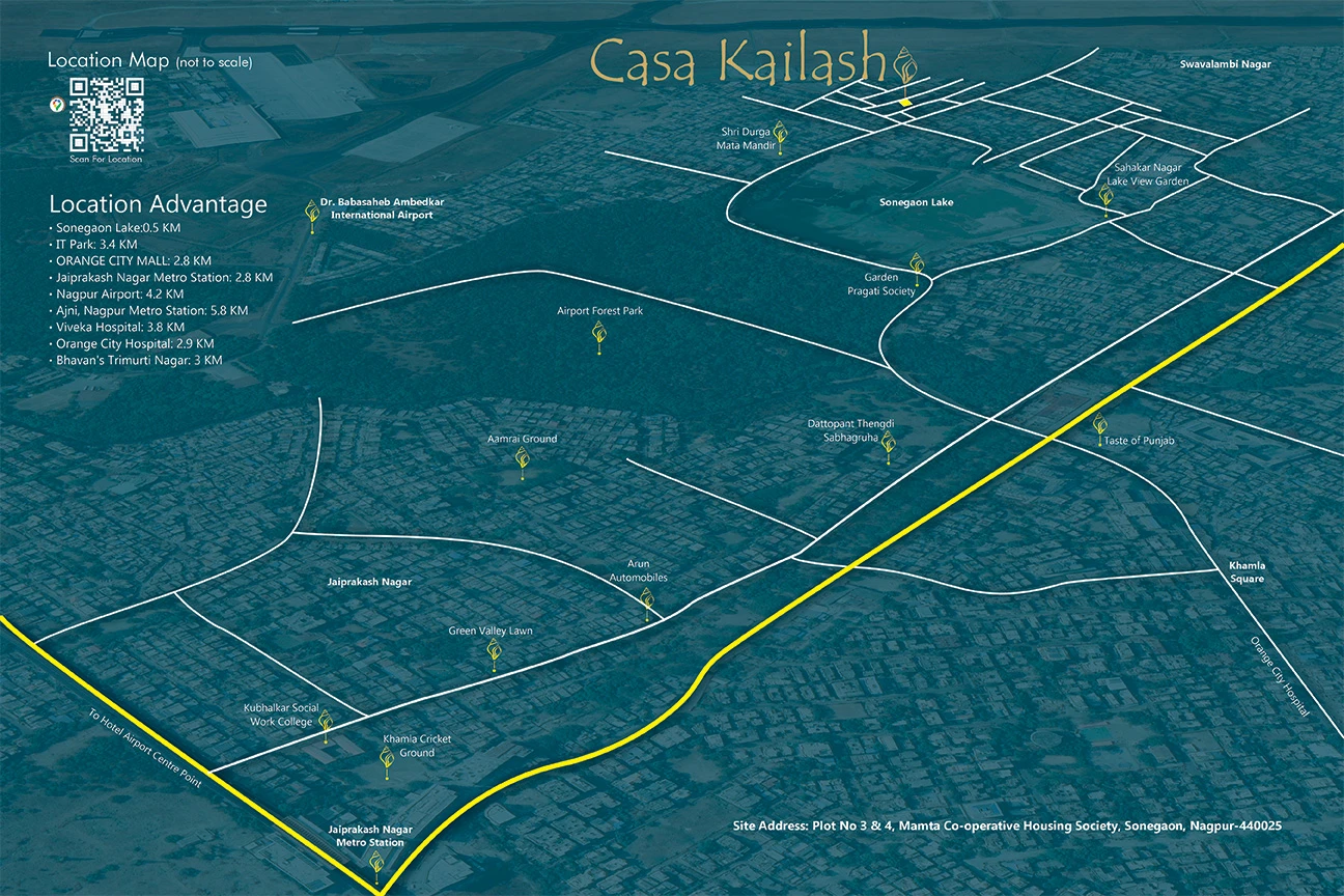 For over decades, Sharda Builders has been redefining luxury living and shaping lifestyles through some of the Nagpur’s finest developments. We don’t just build homes; we create beautiful spaces where every detail reflects an elevated lifestyle. Whether it’s meticulously designed residences, our developments seamlessly blend exemplary design, attention to detail, and unparalleled service. Now, introducing yet another landmark in Sonegaon, CASA KAILASH is a serene enclave that perfectly balances tranquility and convenience. Casa Kailash Apartments in Sonegaon, Nagpur is go to location in the city, it is well made and is connected with all the amenities you need. If you are a frequent air traveler, then you’ll be happy to note that airport is less than 10 minutes from this location. Being situated near Sonegaon Lake, you will be filled with natural surroundings around it.